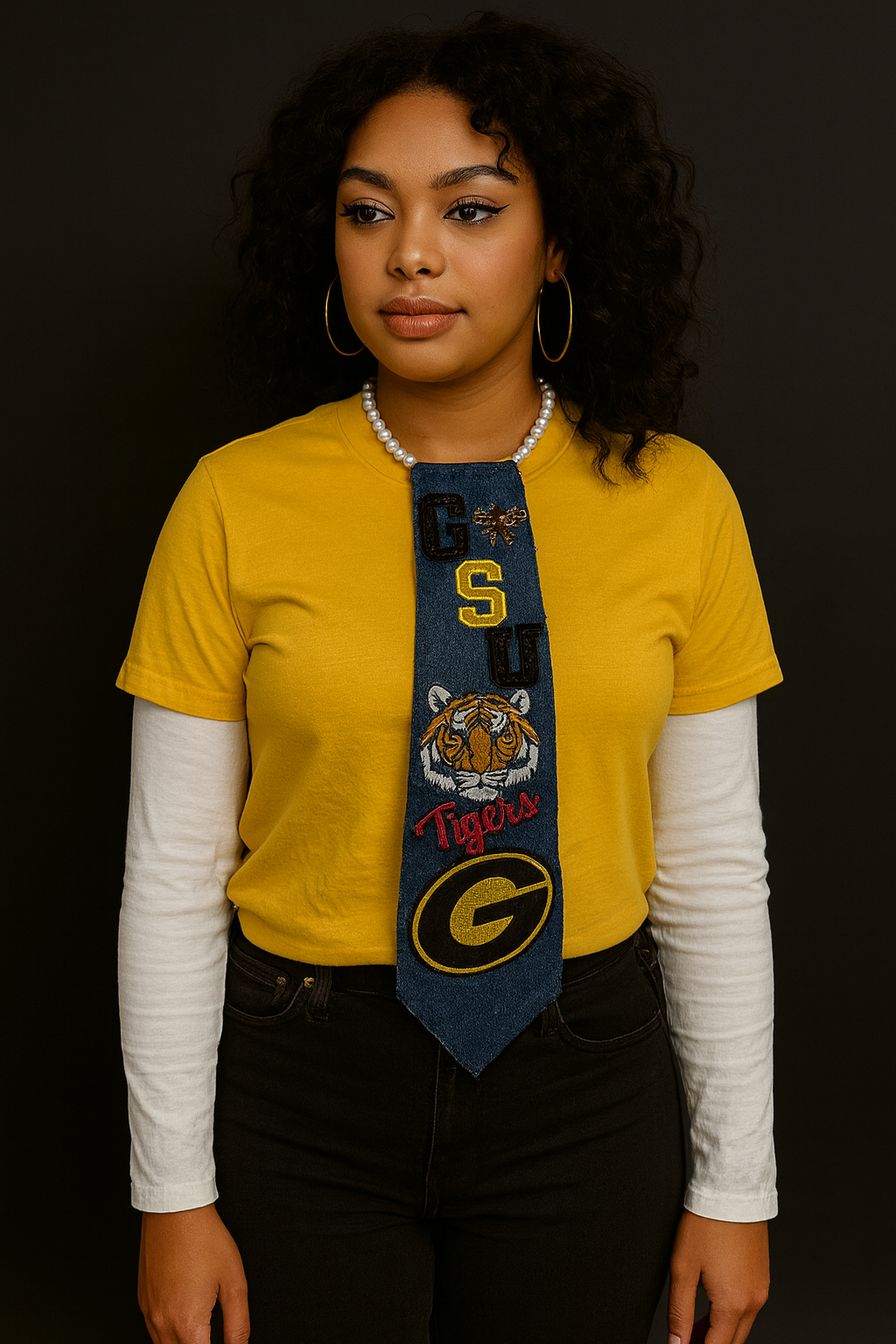 Handmade no-sew embroidered necktie featuring a matching brooch and necklace. Each tie is individually crafted, so no two are exactly alike — making every piece unique. The embroidery design stays consistent with the style you choose for a polished, custom look.